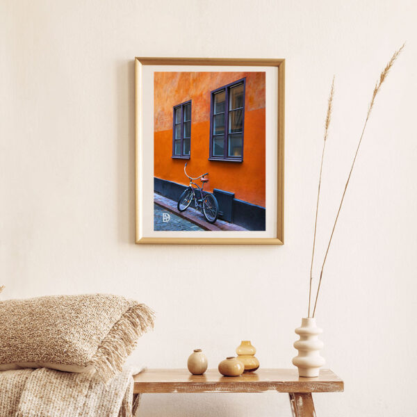 Kuva syntyi, kun kävelin Tukholman kapeilla kujilla ja näin tämän liilan retro-polkupyörän nojaamassa lempeän okrankeltaista talonseinää vasten. Ikkunan puitteet sointuivat samaan sävyyn pyörän kanssa. Hetki tuntui pysähtyneeltä – kuin olisin astunut vanhaan eurooppalaiseen elokuvaan, jossa tunnelma on rauhallinen, lämmin ja kutsuva.